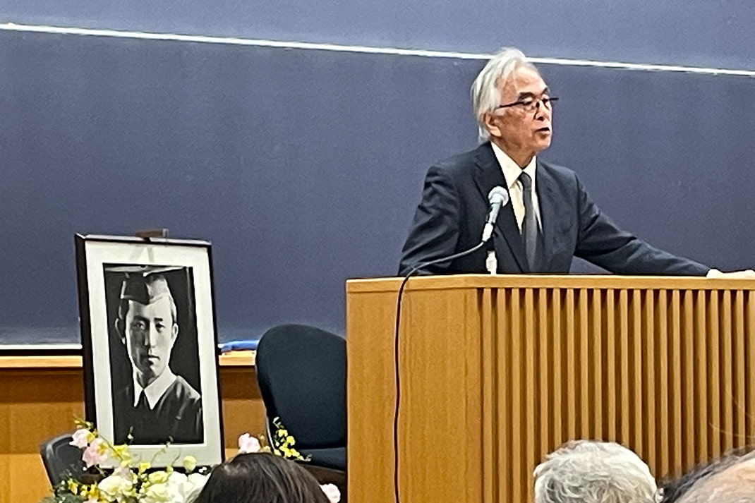 第2部では5123教室において、立教大学名誉教授で旧約聖書の研究者である月本昭男先生に、「尹東柱の詩にみる『共感』の諸相」というタイトルで講演をいただきました。月本先生はまず、朝鮮半島出身者だったお父様のことについて触れられました。