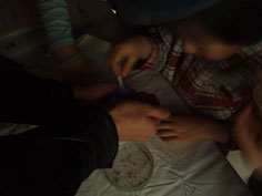 暗室での発光実験2 実際にウミホタルに触ってもらいました。触れられるとウミホタルが青く光ります。みんな予想外に固いウミホタルに驚いていました。 |