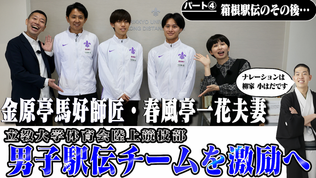 卒業生である落語家夫婦の金原亭馬好さんと春風亭一花さんが、新座キャンパスと男子駅伝チームの拠点へ訪問。柳家小はださんのナレーションのもと、髙林祐介男子駅伝監督や選手たちと対談し、箱根駅伝に向けた戦略や、選手たちの日常、将来の夢まで深く掘り下げています。