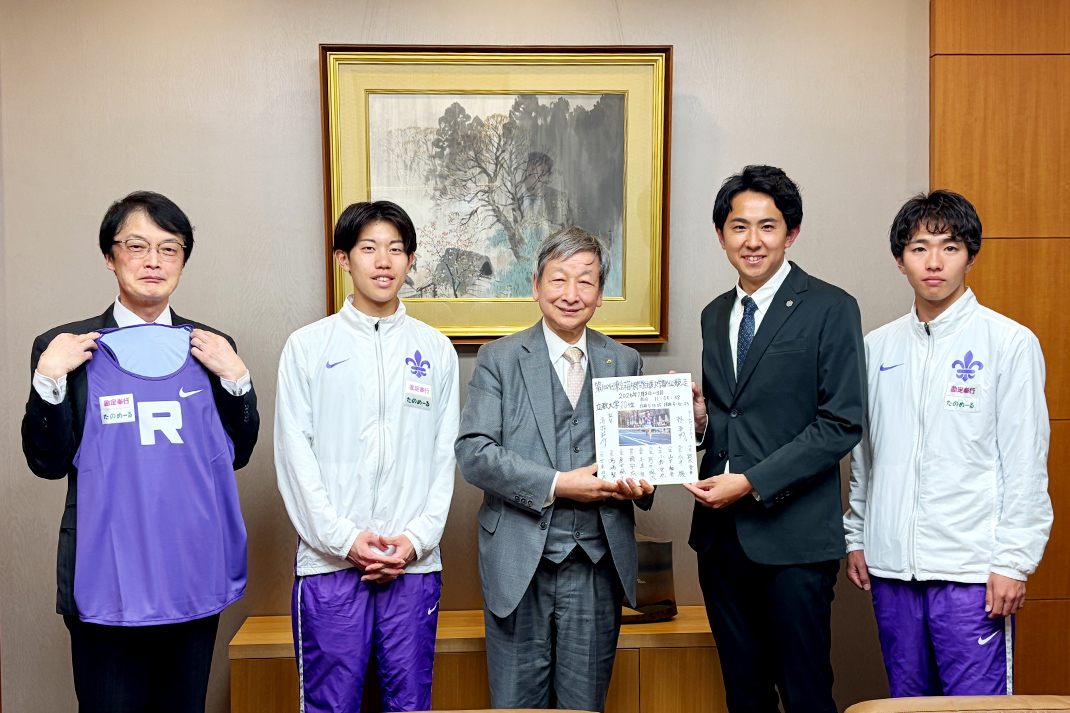 左から、原田颯大主将(4年次)、髙林祐介監督、並木傑市長、塚本匠主務(3年次)、石川淳統括副総長
