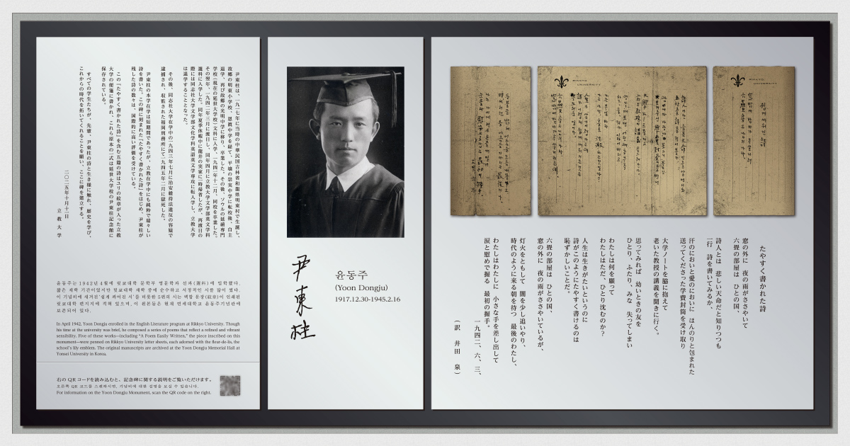 윤동주의 본교 재학 기간은 짧았으나, 릿쿄 재학 중에도 순수하고 아름다운 시를 썼다. 이 비석에 새겨진 『쉽게 씌어진 시』를 비롯하여 윤동주가 남긴 수많은 시들은 국제적으로 높은 평가를 받고 있습니다.